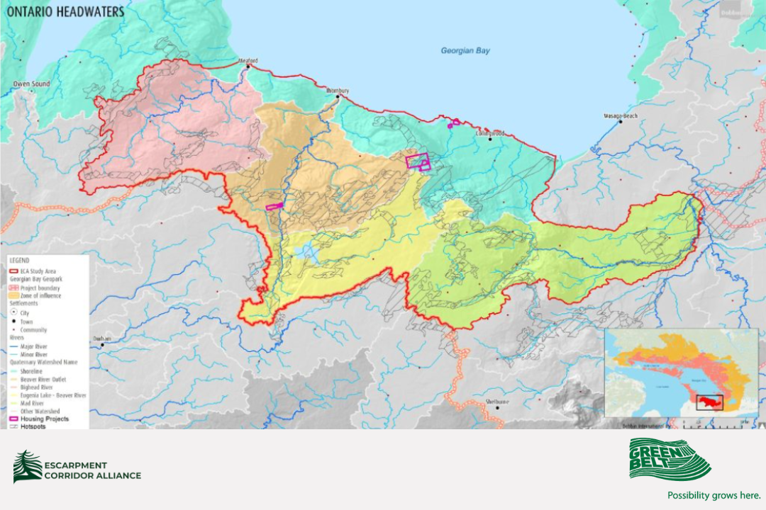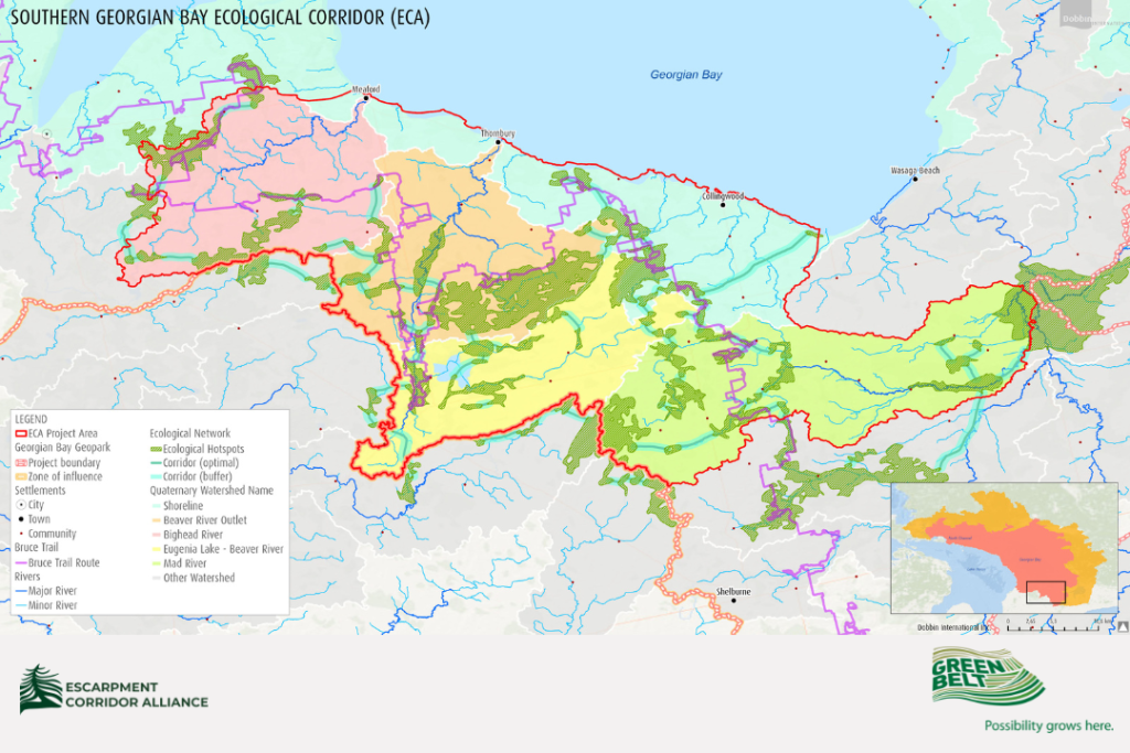 In the video below, Jim Dobbin, President of Dobbin International, shares key findings from the study that helped shape the ECA’s refined Area of Influence and a vision of a potential connected natural corridor in South Georgian Bay. The Escarpment of South Georgian Bay – part of a UNESCO World Biosphere Reserve – is largely protected under Ontario’s Greenbelt Act. Despite this, the region remains under ongoing pressure from development due to its proximity to nature, recreation, and Canada’s largest population centre. The ECA is grateful for the support of the Greenbelt Foundation by helping to fund this geospatial analysis through their 2024 Resilient Greenbelt Fund. This foundational work will ensure the ECA’s activities as a new land trust will be rooted in science – protecting nature, supporting people, and safeguarding this region for future generations.