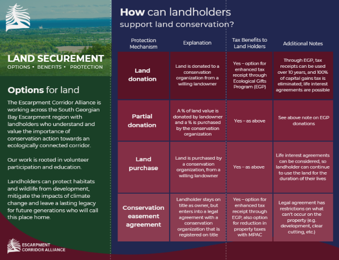 - Incorporating new conservation tools, as YOUR land trust. Our work in this space is guided by the Canadian Land Trust Standards & Practices and supported by the Ontario Land Trust Alliance. As a recipient organization of Canada’s Ecological Gifts Program (Ecological Gifts Program: overview – Canada.ca) – ECA donors of ecologically sensitive land can receive enhanced tax benefits and we can help you determine which options work best for you and your family.